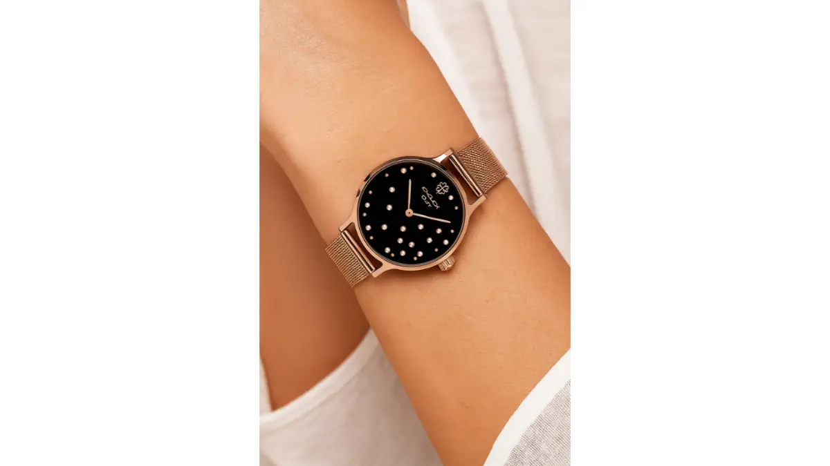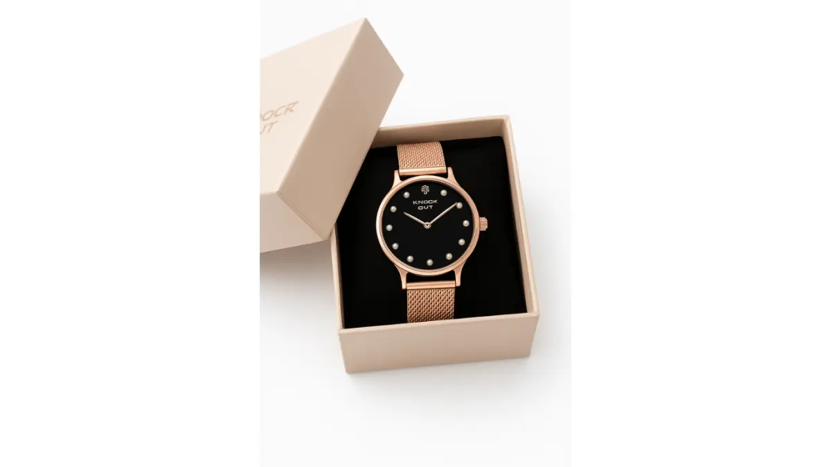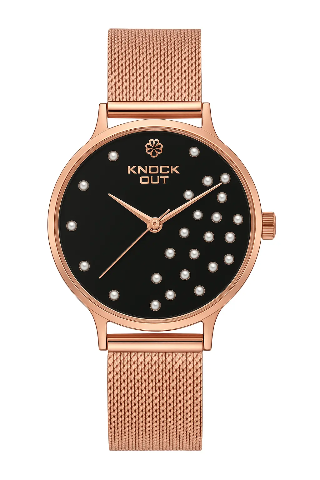 El Reloj Knock Out Rose Gold es un accesorio elegante y versátil diseñado para mujeres que desean destacar con un estilo moderno. Su malla metálica en tono oro rosa y su esfera negra decorada con perlas brillantes crean un contraste único, sofisticado y llamativo.